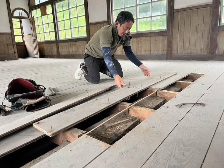 こちらの写真は、仮に一階の柱をなくしても建物の強度は保たれるのかを見るために、二階の床板を外した上で床下を覗いて確認する作業中の写真です。