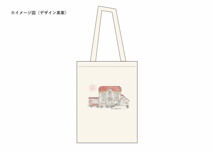 続いて、オリジナルの限定エコバッグです。建物のイラストは、島根県立大学在学中から建物のある金城町にあるかなぎシェアハウスに住み、「金城町の溢れる魅力マップ」を制作した上代美帆さんが描きます。卒業後も金城町や美又地区に定期的に通ってきていて、今回、絵葉書のイラストも描いてくれています。