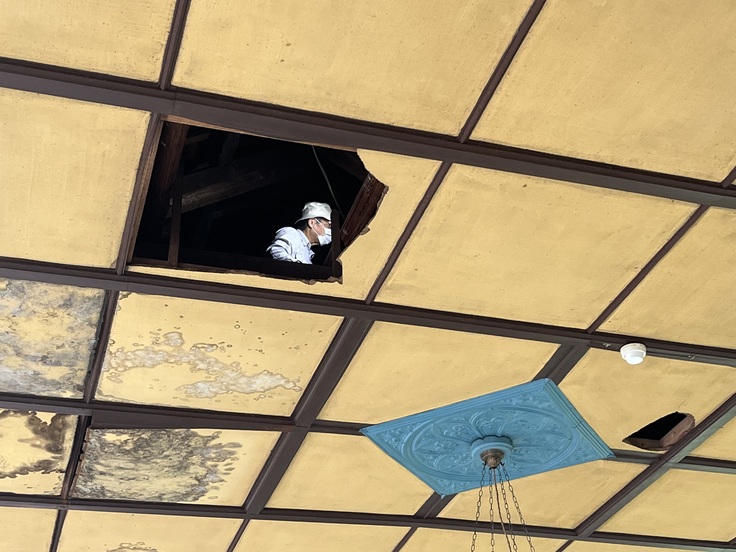 島根県建築士会の皆さんのご協力で、屋根裏に打ち付けてあった棟札と板図を取り外して調査が行われました。