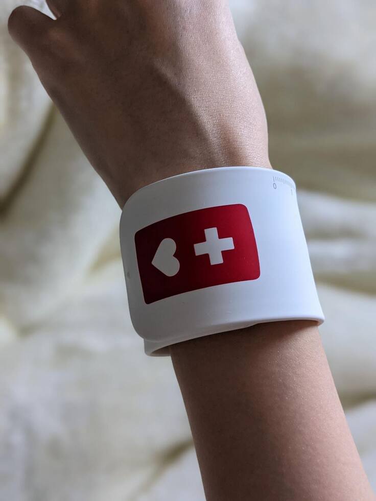 - 今回のヘルプマーク付きwemoは腕につけるリストバンド型です。災害時に大勢の人が避難所などに集まっている時、障害者や配慮の必要な高齢者・妊婦の方などに付けて貰うと、一目で援助の必要な人が判別できます。