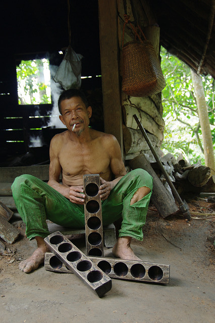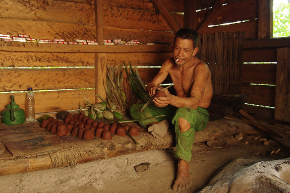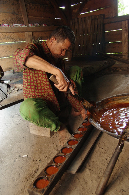写真のおじさん、ジャイムンさんは村一番のヤシ砂糖づくりの名人です。