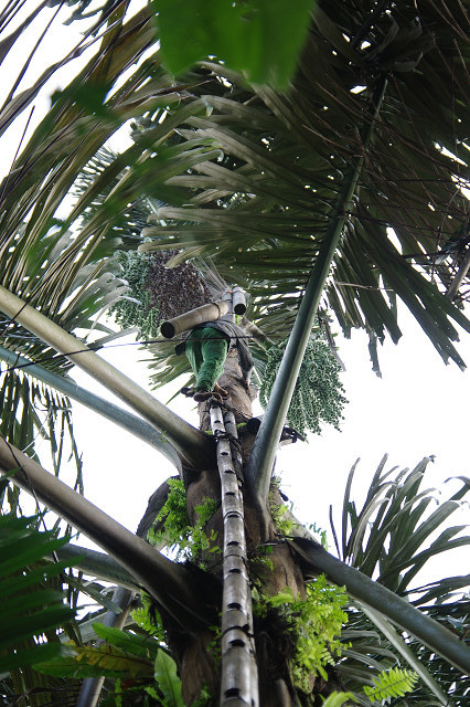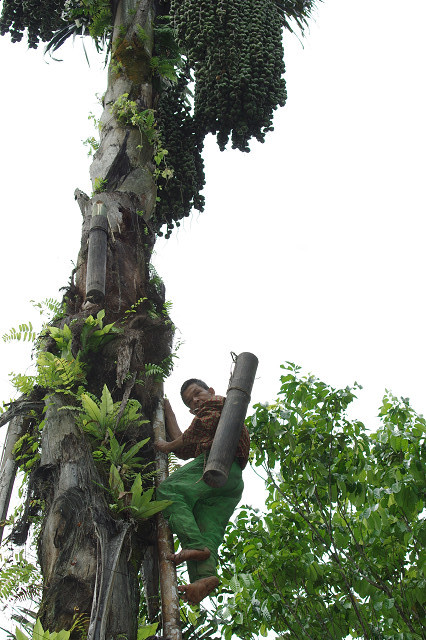 午前中の作業は、何本かのサトウヤシの木を回っての、竹筒の回収・交換です。