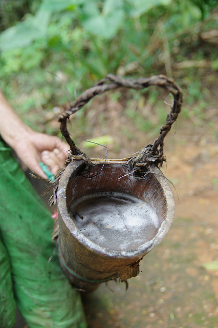 朝一番の作業は、すでに樹液でいっぱいの竹筒を、空っぽの竹筒と付け替えることから始まります。