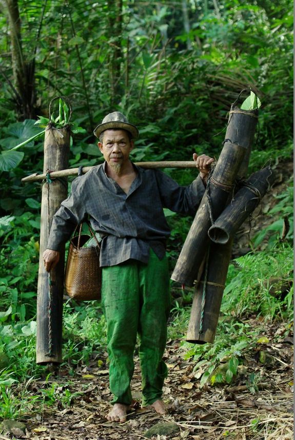 朝7時、朝食を済ませたジャイムンさんは、竹筒を担いで里山の森に入ります。