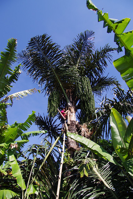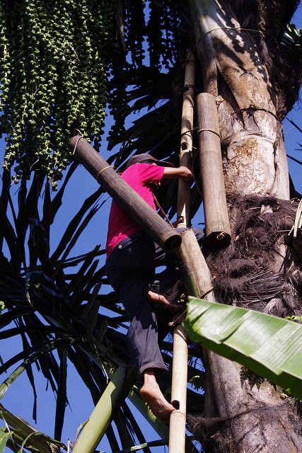 竹筒を担いだアニムさん、高さ8mほどのサトウヤシの木にひょいひょいと登っていきます。