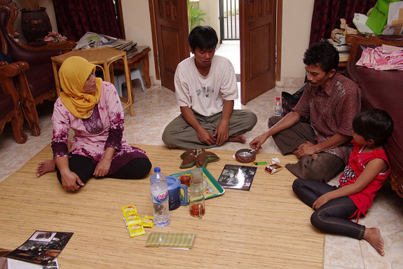 アニムさんご夫婦の末娘、6歳のシティちゃんが抱えているのがサトウヤシの苗木です。