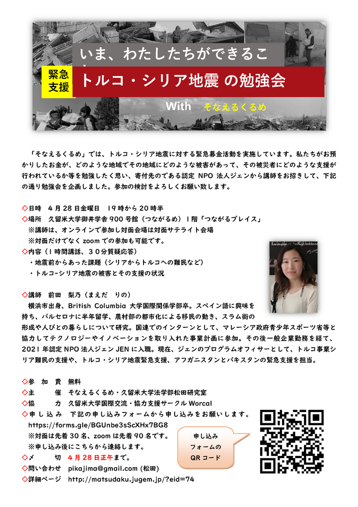「そなえるくるめ」では、トルコ・シリア地震に対する緊急募金活動を実施しています。私たちがお預かりしたお金が、どのような地域でその地域にどのような被害があって、その被災者にどのような支援が行われているか等を勉強したく思い、寄付先のである認定NPO法人ジェンから講師をお招きして、下記の通り勉強会を企画しました。参加の検討をよろしくお願い致します。