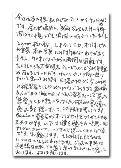 そして2011年3月11日、東日本大震災がおこりました。その4ヶ月後、岩手でジャズ喫茶を経営されていた、70歳の男性からお手紙をいただきました。
