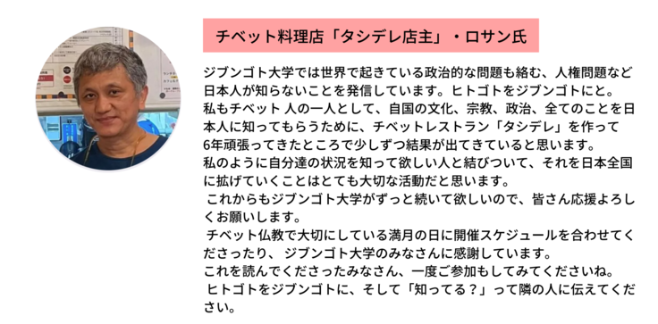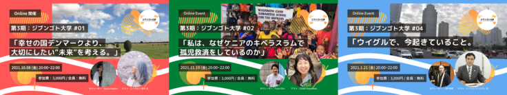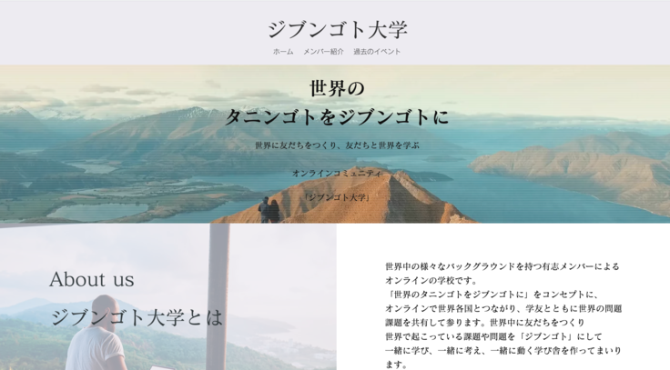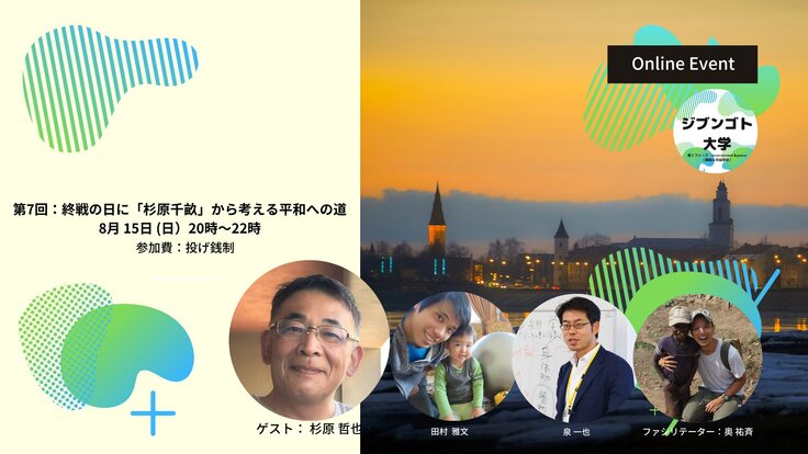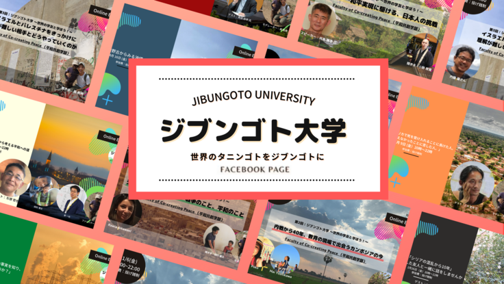 世界のタニンゴトをジブンゴトに。 2020年8月からシリア難民について知るオンラインイベントをZOOMにて開催。 その後同年10月よりジブンゴト大学と名付けたオンラインコミュニティを立ち上げ、シリアをはじめカンボジア、ミャンマー、イスラエル・パレスチナ、沖縄、環境問題など世界の現状を届ける。 話し手の人生を追体験し、共に共有、対話することを大切にしている。 2021年8月までに計14回実施、参加者は毎回25名以上。 多くの方がリピーターとなっており、参加者を学友と呼んでいる。 “世界に学友をつくることで、一人でも多くの人が世界のどこかのタニンゴトをジブンゴトとして捉え、新しい行動に繋がる場にしていきたい”、そんな想いで集った有志メンバーで運営する任意団体。