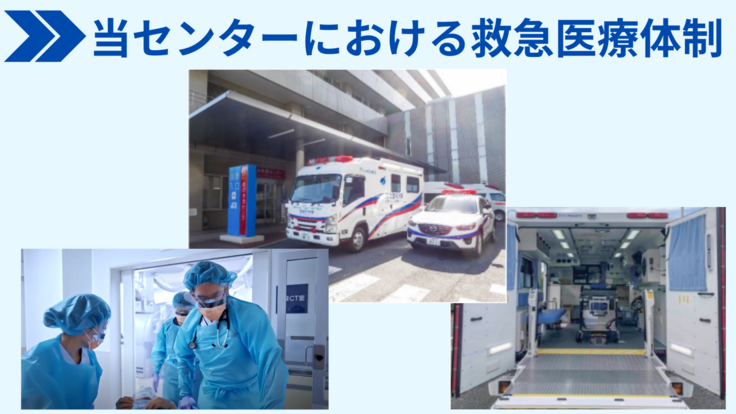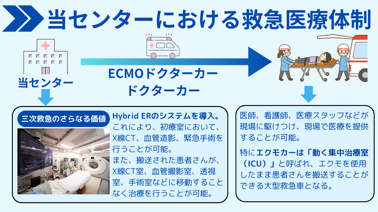 当センターにおいては、現場へ急行する「ドクターカー」と重症患者を搬送する「ECMOドクターカー」の2台の運行を実施しており、地域の皆さまの命と健康を守るべく、日々奔走をしております。