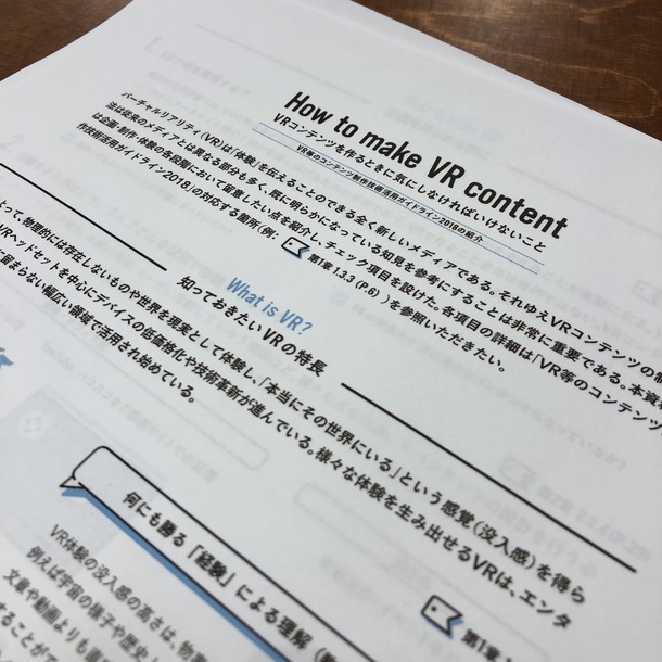 まずは参加者さまにVRを理解していただくため、特定非営利活動法人 映像産業振興機構(VIPO)・株式会社Mogura が発行する資料を活用しています。