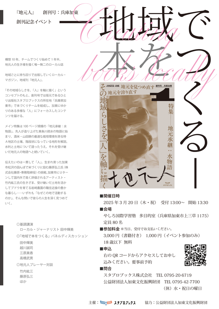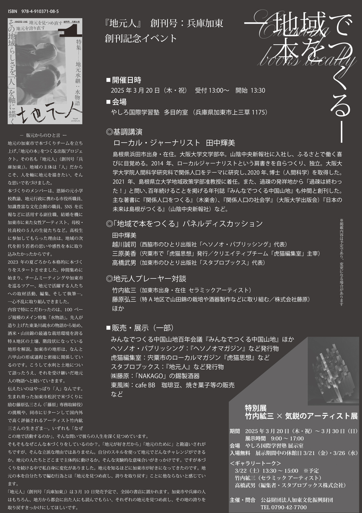 3月20日(木・祝)、加東市の文化会館「やしろ国際学習塾」(兵庫県加東市上三草1175)で『地元人』の創刊記念イベントを開催することになりました。