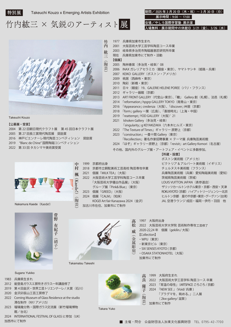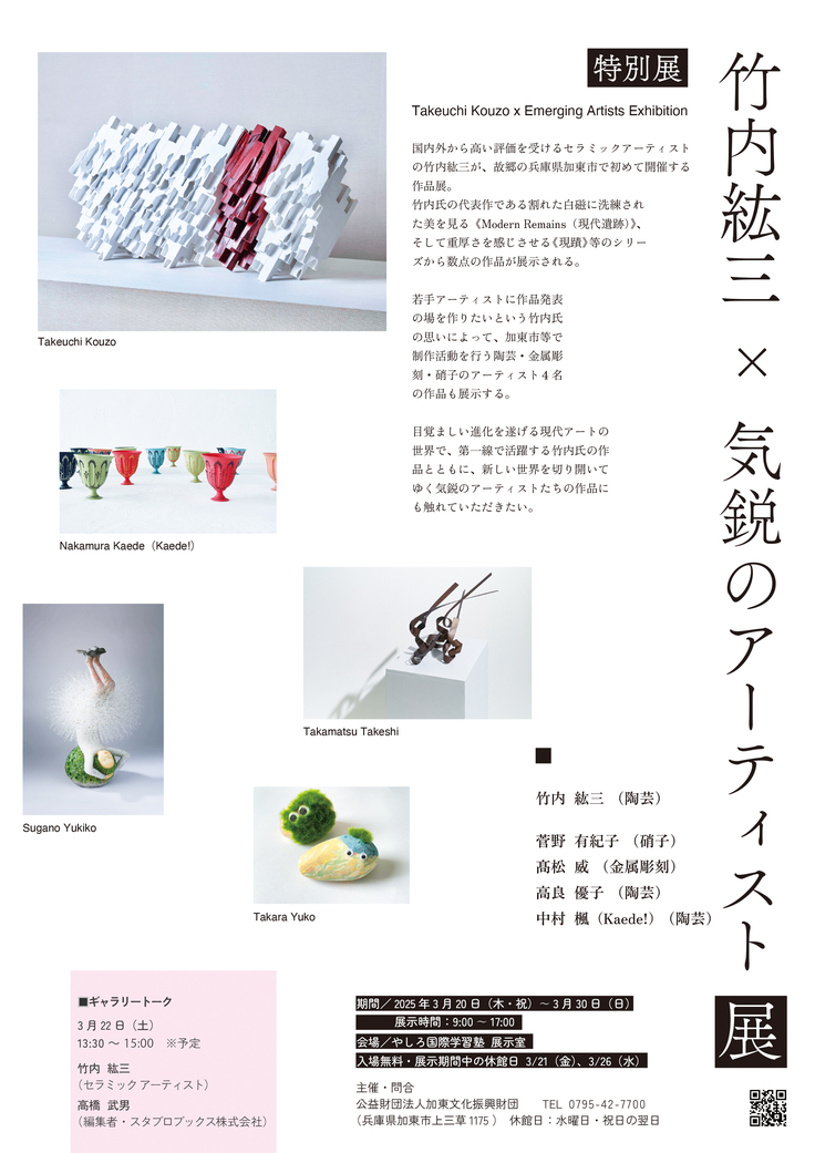 さらにこのイベントにあわせて、加東市出身・在住のセラミックアーティスト、竹内紘三氏と気鋭アーティストの作品展も同時開催されることになりました。3月22日には、竹内氏自ら作品を紹介するギャラリートークもおこなわれます。3月20日の創刊記念イベントとあわせてぜひお楽しみいただけると嬉しいです。