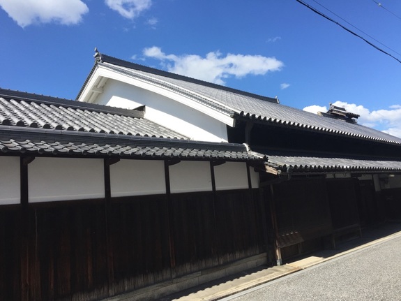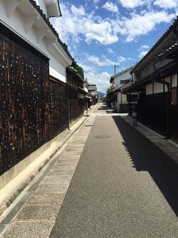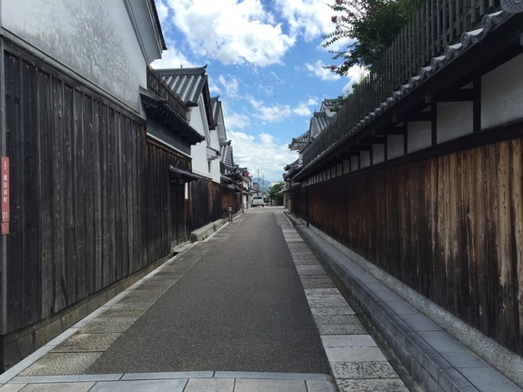 青い空、白い雲の下に続く瓦と板塀、白壁の道は時間が止まったかのようです。