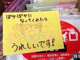 復興支援活動を続けている山田智子さんは、ワークショップにご参加いただくみなさんにお書きいただく応援メッセージとともに冬はホッカイロを、そして今回は夏ですので冷えピタを被災地の方々にメッセージとともにお渡ししています。実際に3.11で被災された山田さんだからこそ、その時その時で何が必要とされているかを考えられての取り組みです。
