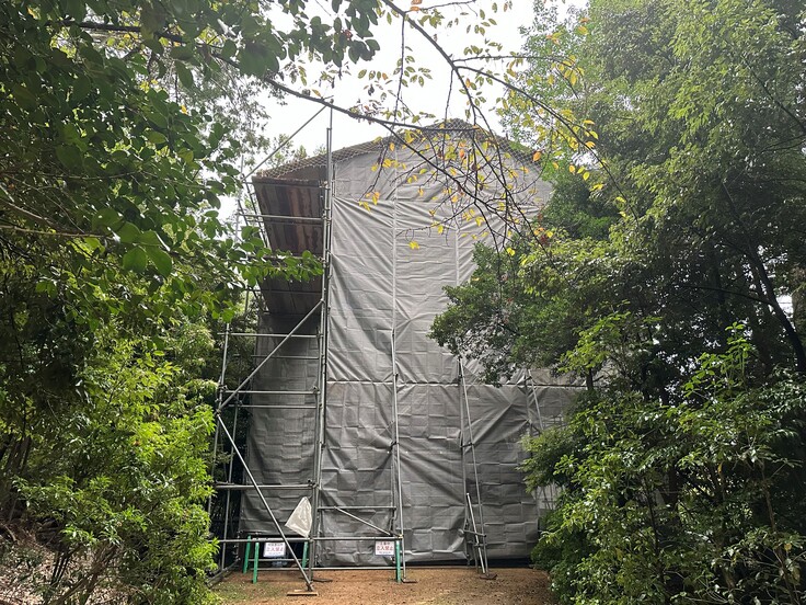 現在、神護寺境内では鐘楼堂の足場工事が開始しております。皆さまから頂戴いたしましたご支援は第一期工事として行われますこの足場に始まり、杮を剥がしながら、どの程度傷みが進んでいるのか、下地の様子などの調査の費用として大切に活用させていただきます。