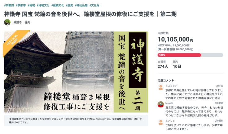 そこで募集終了となる6月23日(月)23時まで残り10日間となりますが、第二目標として1,500万円を掲げて挑戦を続けることといたしました。皆様からいただいたご支援は、引き続き鐘楼堂屋根修復に向けた第二期工事の費用として、大切に活用させていただきます。