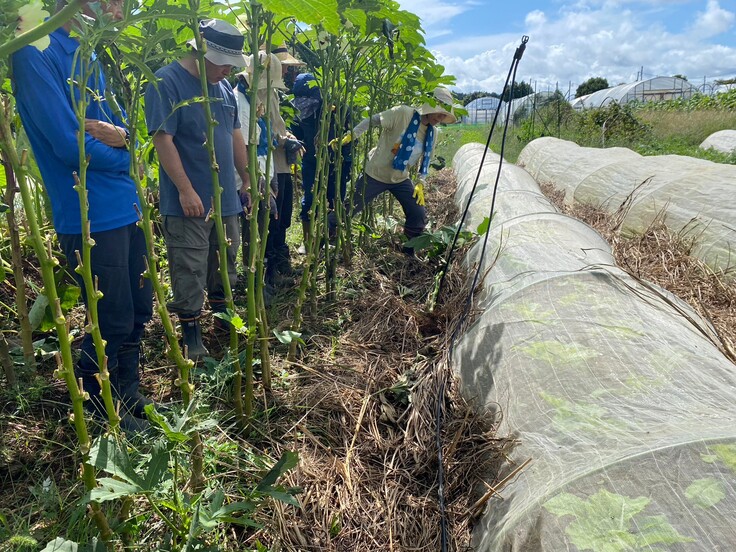 同じ日に同じオクラの種をまいても、ビニルマルチと敷き草で、ぜんぜん生育が違いました。原因はセンチュウ被害。ビニルマルチは被害が大きく、敷き草ではほとんど被害がありませんでした。研修生一同、驚き!