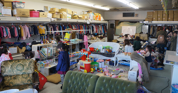 3月25日(土)も午後1時~6時まで、サンタハウスチャリティバザー併設カフェスペースにて、開催されました。キッズスペース(サンタハウスとバザー会場の2か所にあります)もありますので、子供たちも毎回楽しみにやってきます。バザーの運営準備は、お母さん方が中心になりして下さっています。