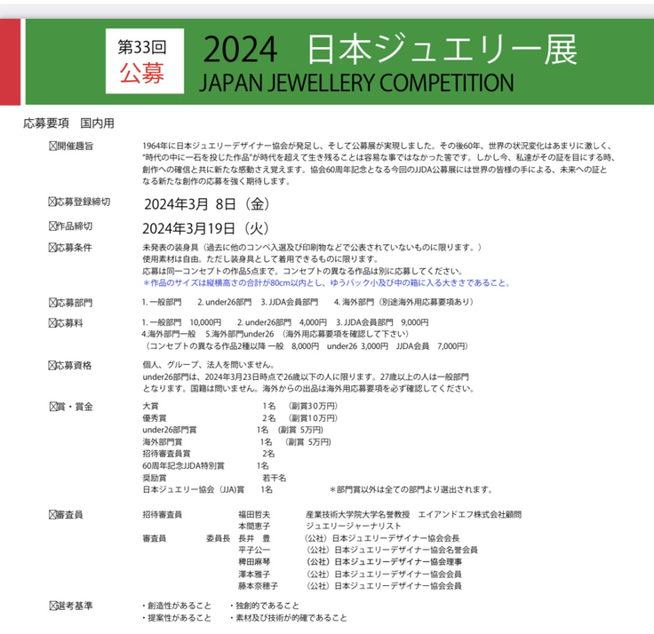 協会60周年記念となる今回のJJDA公募展には、世界の皆様の手による、未来への証と なる新たな創作の応募を強く期待します。
