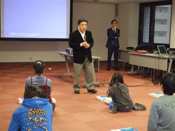 (愛知県医師会館で行われた子供心肺蘇生講習。受講生は小学生です。)