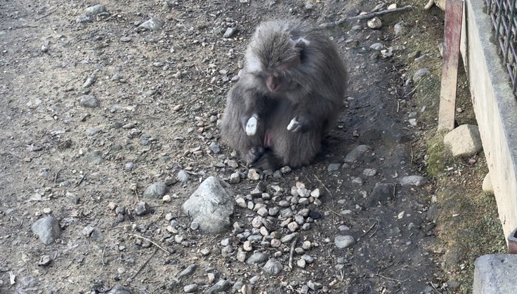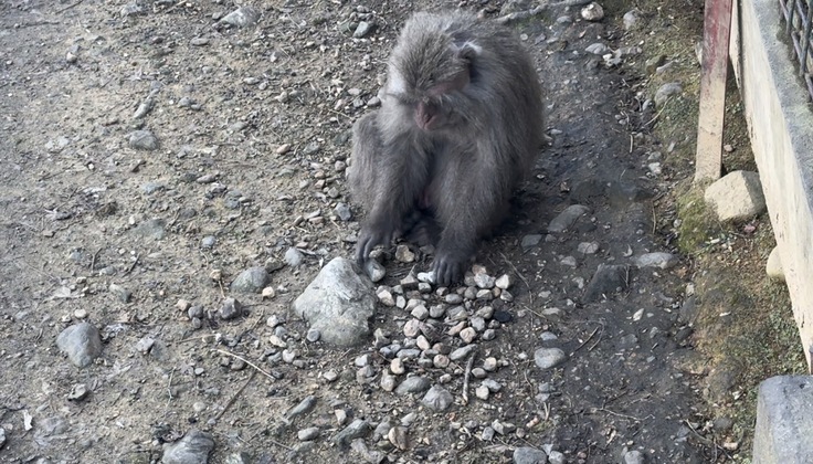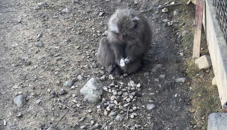 こちらはモンキーセンター内のモンキーバレイにくらすヤクシマザルたちの中にお気に入りの石を探しながら落ちている石を拾いカチカチ音を鳴らす個体が居ます。