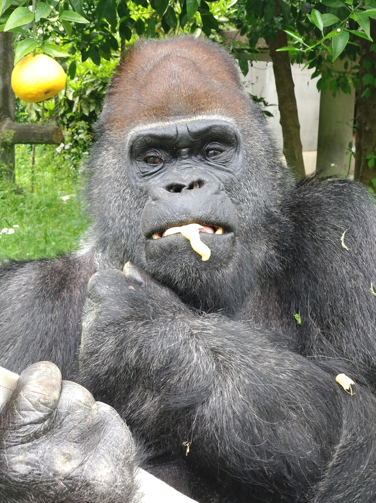 私の担当はアフリカセンターといって、野生ではアフリカにすむニシゴリラ、チンパンジー、バーバリーマカク、ポト、非展示施設にはマンドリルがくらす施設です。モンキーセンターのさまざまな個性的な返礼品のなかでも日本最高齢のオス、ニシゴリラのタロウさんがかじった枝にどうしても注目してしまいます。感謝の気持ちをもっとこめて、タロウさんを少しでも身近に感じていただきたく、タロウさんが口だけで割った落花生の殻や、タロウさんが剥いた柑橘類の皮、タロウさんの匂いがついた布。などなど、本当は個人的に考えたものもプラスしてそっと一緒にお贈りしたかったです。