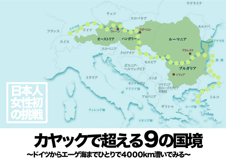 コースはドイツのドナウ川を起点に→オーストリア→スロバキア→ハンガリー→クロアチア→セルビア→ルーマニア→ブルガリア→トルコと、9つの国境に加え、黒海・マルマラ海・エーゲ海と3つの内海を折りたたみ式カヤックで単独で漕ぎます。