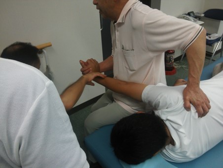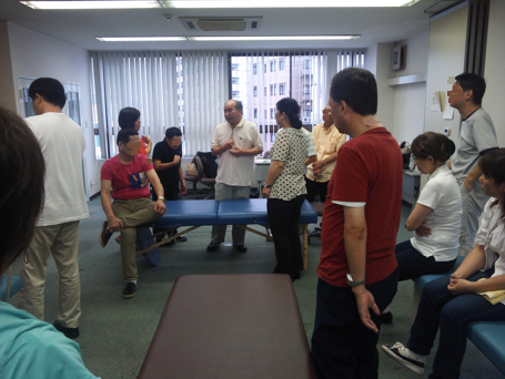 まずはじめに実際に先生に施術してもらい、正しい感覚を体で覚えていきます。参加者はいくつかのグループに分かれて、講師から学んだことをお互いの体で確かめ合い学んでいきます。場合によって、逆に先生に試してみることで講習会は進んでいきます。体で覚えることが視覚障害者にとって一番効果がある勉強法なので、そのような環境を準備します。