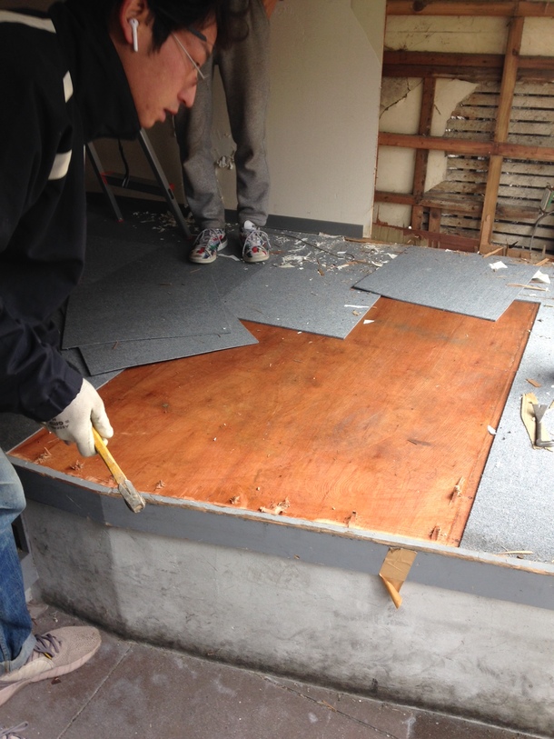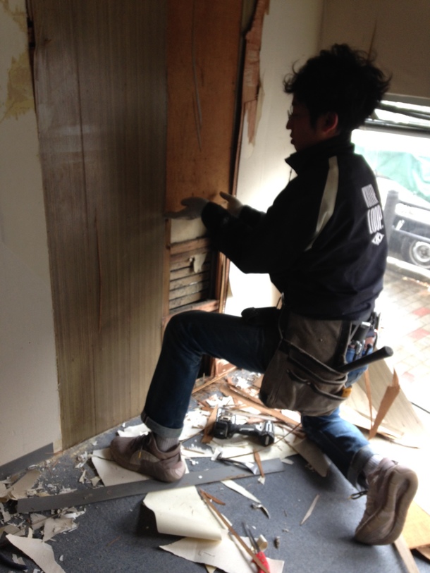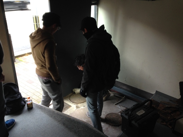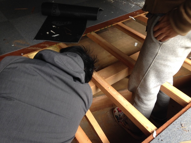 浄土複合の改装工事に先立ち、浄土複合メンバーや友人のアーティスト達と共に”壁”と”床”の調査を行いました。普段から、展示設営などで、木材などを触るのは慣れてはいるものの、建物の構造は別問題です。そこで今回の改装は「たま製作所」の全面協力を得て行うことにしました。