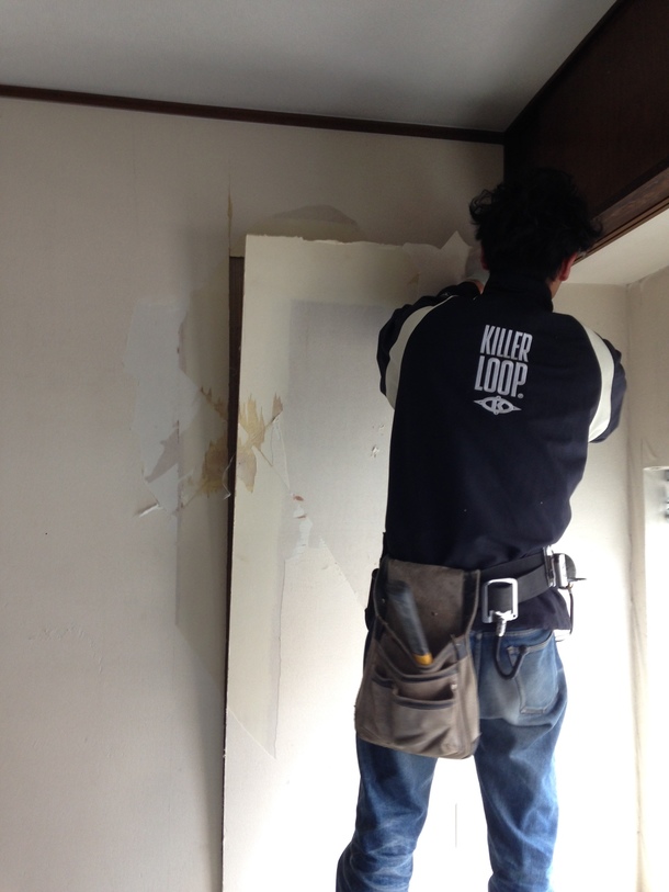 壁に切り込みを入れ、剥がしてみます。