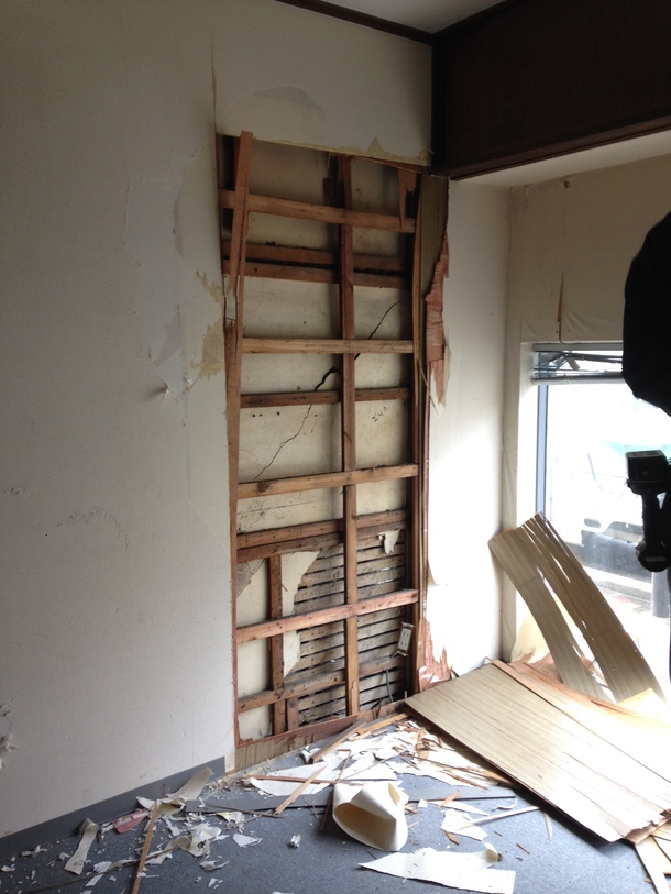もともとは隣の建物と一つの空間だったのを、間に土壁を立てて仕切ったような気がします。それにしてもだいぶ内部は荒れている。土壁はゆがんでひび割れていて、そこに木材で構造を足して、合板を上から貼っているようです。