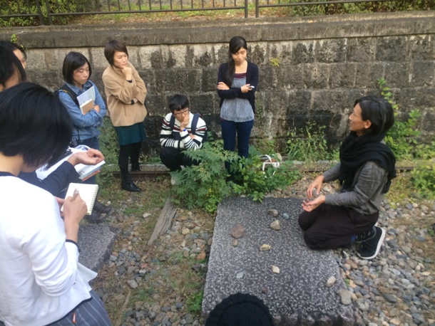 さらにそれに続く石組みワークショップでは、参加者が石を選んで石同士の関係を意識しながら配置していく、そのシンプルな作業を通して、庭師による身体的判断を体験することができました。