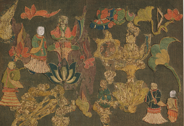 刺繍というものは糸でできていますので、それほど耐久性があるわけではありません。実際のところ残っているのは刺繍の断片のみ。しかし、残欠と呼ばれる繡帳の一部は飛鳥時代に作られたものにもかかわらず、非常に色鮮やかに形をとどめています(これに対して、鎌倉時代に作られたこの作品のレプリカがあるのですが、こちらは完全に退色し、形も崩壊していることからも、飛鳥時代のオリジナルのヴィヴィッドさが際立つのです)。