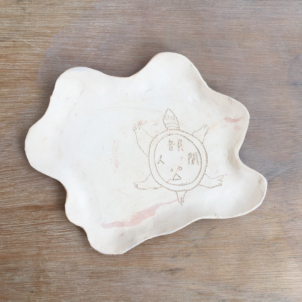世界で一つしかないお皿に、天寿国繡帳に描かれたウサギやカメ、人間、そしてセケンコケという文字(「世間虚仮」という聖徳太子の言葉)をあしらった絵付けがなされます。