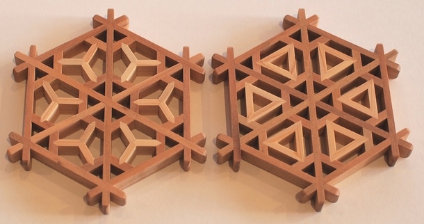 釘や接着剤を一切使わずに仕上げるのが組子細工の特徴です。組子の技術を活かして製作したコースターは、「胡麻殻(ごまがら)つぶし」と「桔梗麻ノ葉(ききょうあさのは)」の2種類の模様があります。2枚1組でお届けします。