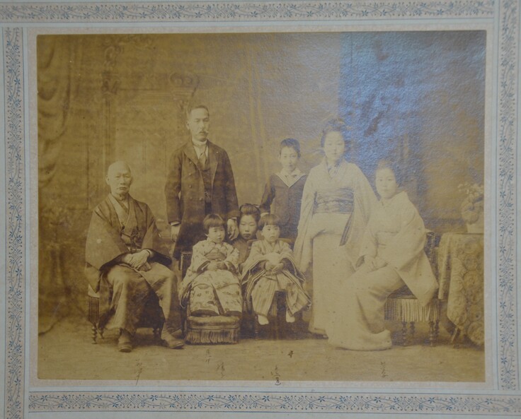 万次郎は、亡くなるまでの17年間を長男の東一郎の家族と共に過ごしました。下の写真は、東一郎と妻の芳子、長女の絲子、長男の幸、次女の榮子、次男の清、そして幼い二人の間にいるのはお手伝いさんの「くに」でしょうか。初代東京市医師会長も務めた東一郎氏は、ジョン万次郎のレガシーが後世に伝えられる上で決定的な役割を果たした『中濱萬次郎傳』を昭和11年に冨山房から出版し、翌年に亡くなりました。中濱コレクションは東一郎氏が礎を築き、子孫が守り伝えたものです。