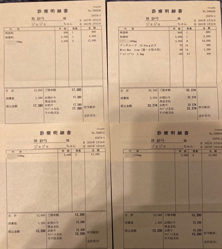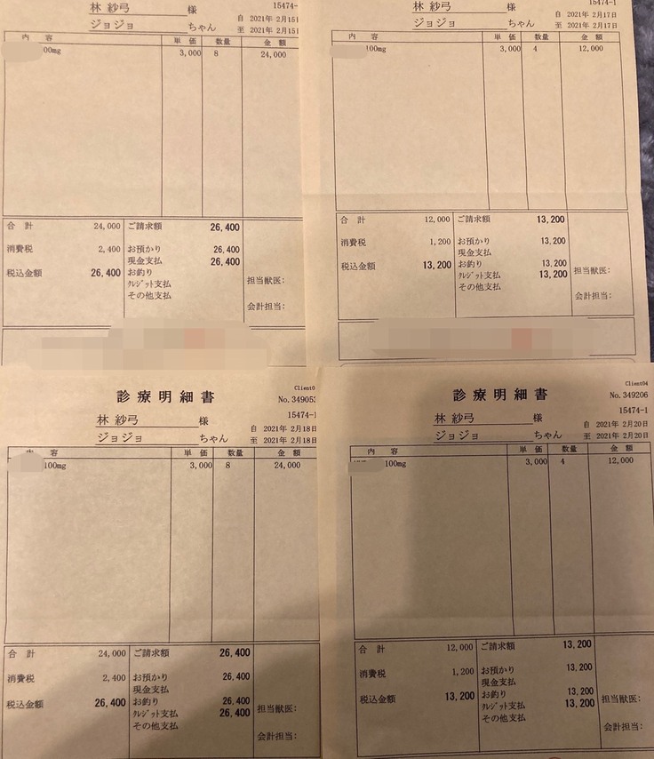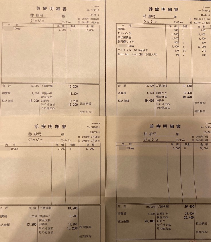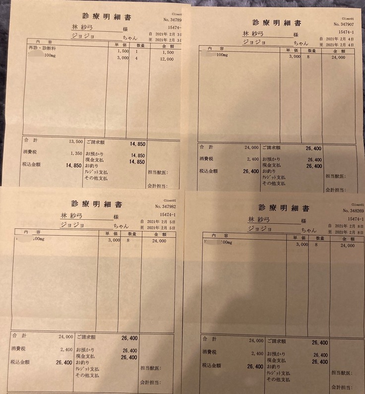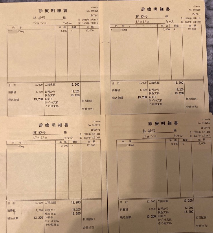 また通院でお店の運営状態も厳しく、アビィも抗体価が少し高めで下痢が続いていたので一週間新薬を試しました。検査代や治療費も含め私がお薬代に用意できた金額は20万です。