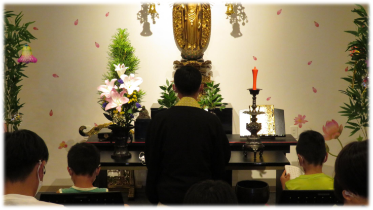 お寺に来ることもお勤めをするのもはじめてという子が多い中、仏さまに手を合わせ、礼拝する姿は実に微笑ましく美しいものでした。みんなにお経の本を配り、間違ってもいいから一緒に読みましょうと始めたお勤めでしたが、子どもたちの声は次第に大きくなり、最後には子どもたちのかわいらしいお勤めの声がお堂の中いっぱいに響き渡っていました!