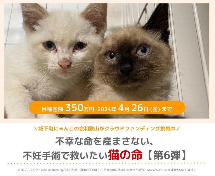 不幸な命を産まさない、不妊手術で救いたい猫の命【第六弾】(城下町にゃんこの会 奥 康子 2024/03/05 公開) - クラウドファンディング READYFOR