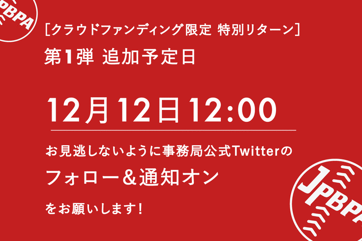 リターン追加に関して、お見逃しないようにプロ野球選手会 選手会ファンド事務局公式Twitter(https://twitter.com/JPBPA_Fund)のフォロー&通知オンでお願いいたします。