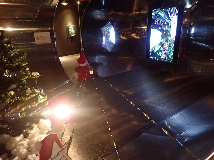 しかしながら、中に入れなくても内部の鏡面の不思議を体験していただくために、鏡面に反射した映像の不思議を入口から覗いて見れるよう、内部に映像を投影しています。