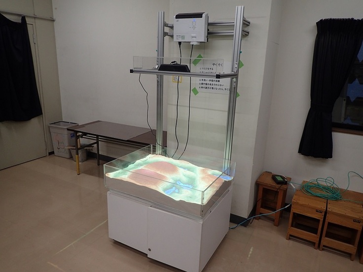 展示概要ですが、砂が敷き詰められた箱内にプロジェクターで等高線の映像を投影します。砂の表面の凹凸をリアルタイムで3Dスキャンし、凹凸の高さ毎に砂の表面に等高線を投影します。