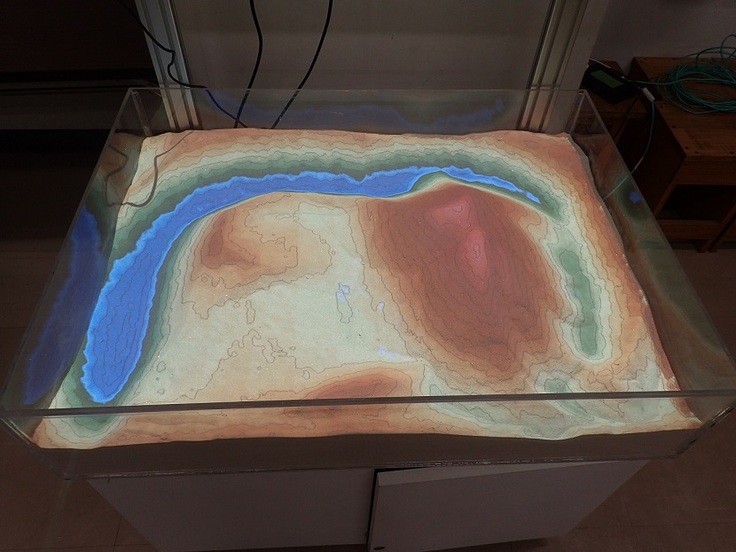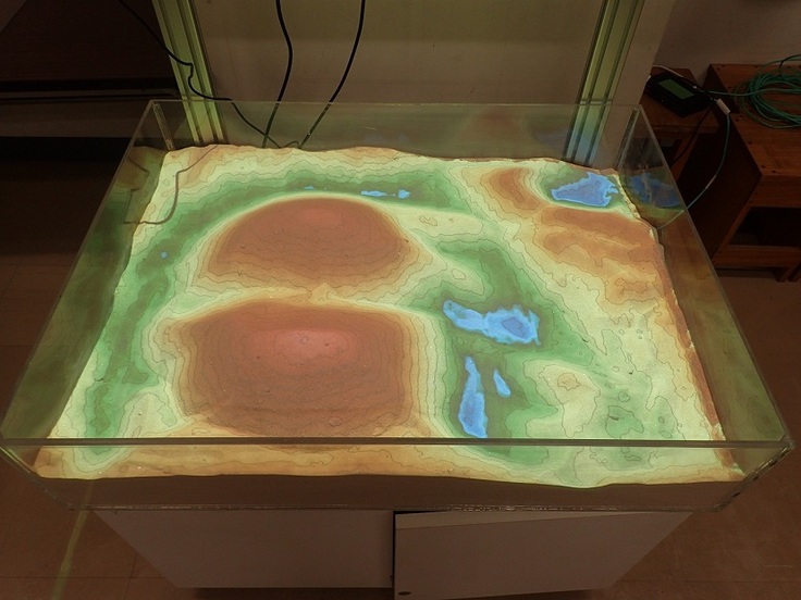 砂を手でかき集めて山をつくったり、掘って谷間をつくったりすると、リアルタイムで砂に投影された等高線が変化します。等高線を立体的に理解できる展示です。