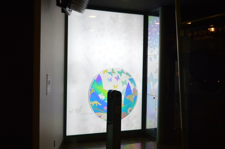 この展示室でまず、目に飛び込んでくるのは、展示室入口左側にある、「トリックギャラリー」です。一見白く見える板を偏光板を通して見ると、色が着いたように見えたり、背景が暗く見えたりします。円盤状の偏光板を回転させることで、見えかたが変化します。