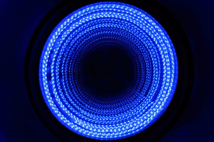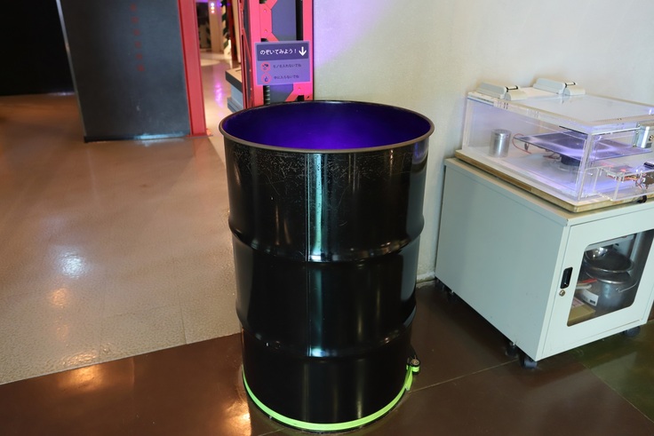 当館の技術スタッフが制作した「底なしドラム缶」。ドラム缶の中を覗くと、奥底まで暗い孔が開いているように見えます。