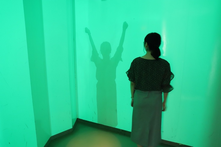 空間の中央付近に立つと一瞬強い光が発行し、壁面に人影が残像として残る「蓄光スクリーン」、