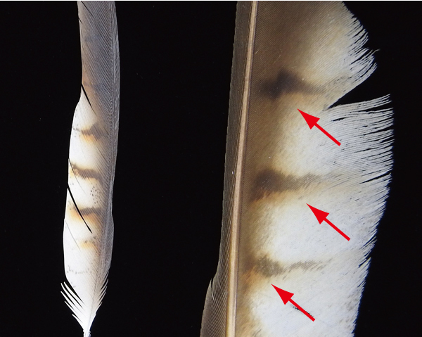 体羽の模様は帯の中が赤茶色、縁がこげ茶色になっています。これもサシバの特徴ですが、しっかりと表現してもらいました。