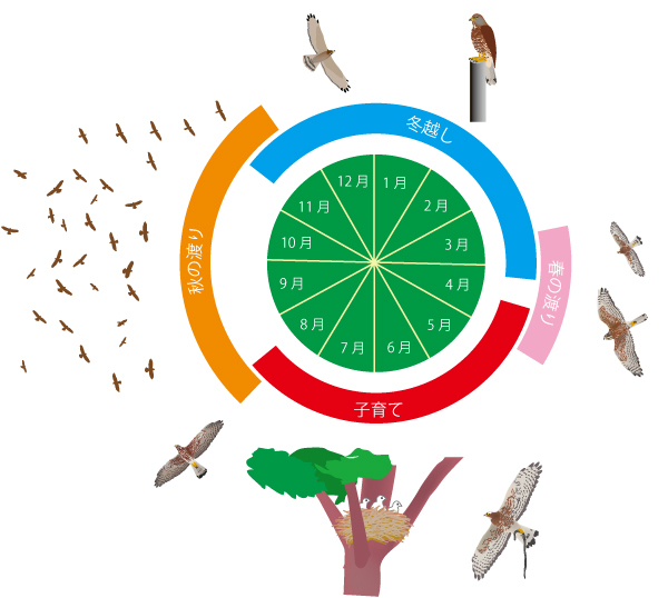 サシバは渡り鳥ということは既に皆さんご存知かと思いますが、1年の暮らしについて簡単にご紹介します。