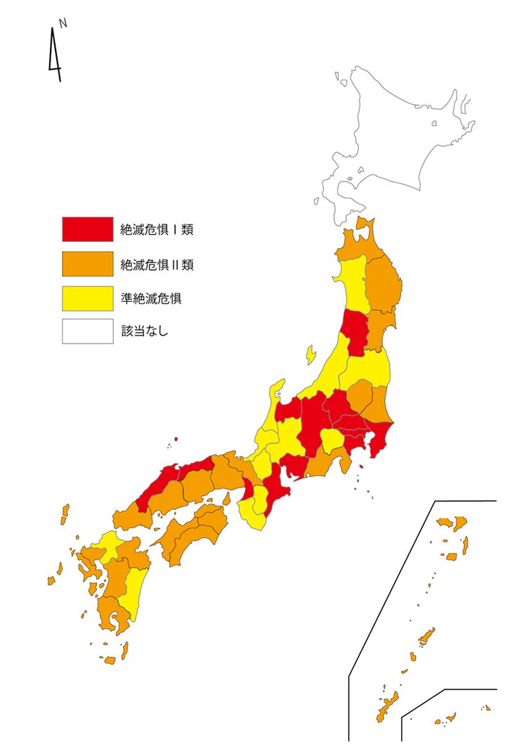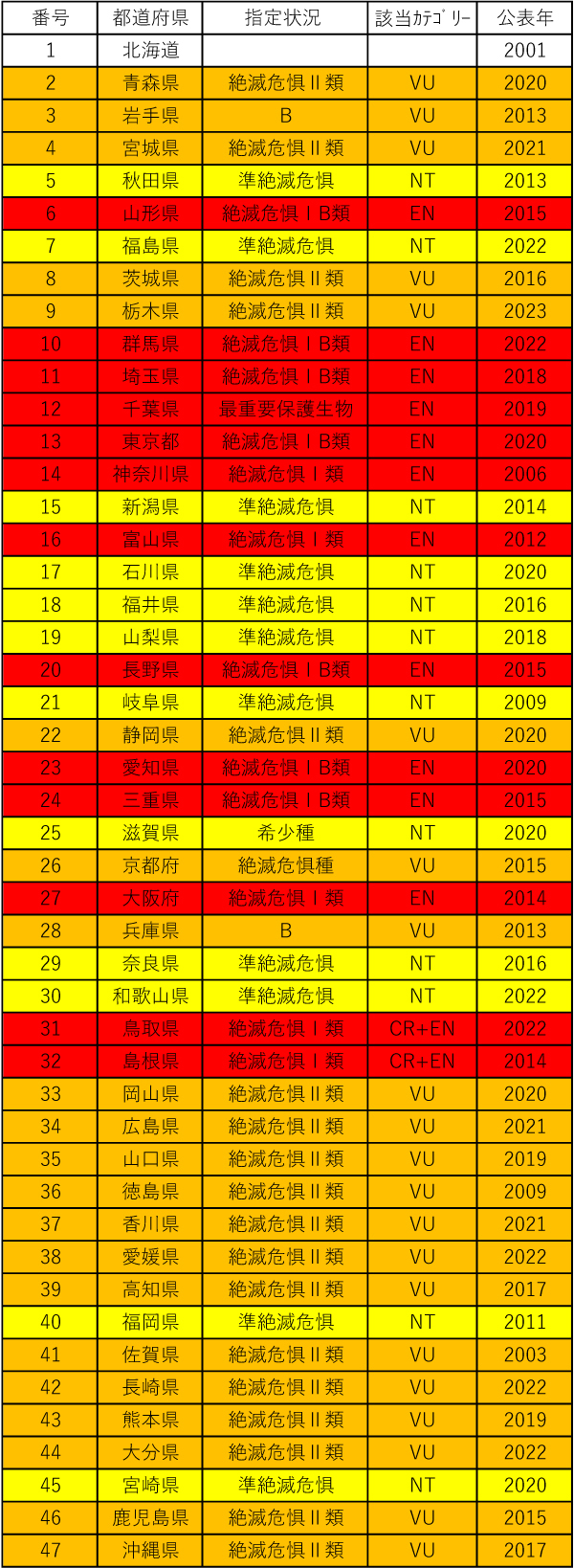 絶滅危惧のランクの中では比較的低いランクの準絶滅危惧に指定されている都道府県の中には、公表年が古いものも見受けられます。これが最新のものに更新される時、ランクはⅡ類やⅠ類に引き上げられる場所もあるかもしれません。